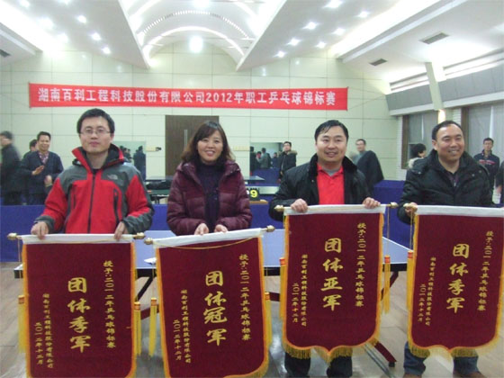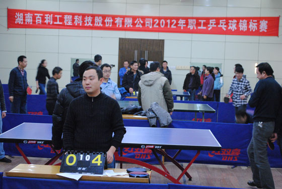 為豐富員工的業余生活,增強身體素質,培養團結合作精神,在公司領導及工會的大力支持和土建室分會的精心組織安排下,2012年12月17日舉辦了“2012年湖南百利工程科技股份有限公司乒乓球錦標賽”。經過近兩周緊鑼密鼓的比賽,于12月26日圓滿落下了帷幕,本次乒乓球比賽為員工提供了相互交流、切磋球技的機會,同時為員工在辛勤工作的間隙提供了一個勞逸結合、強身健體的機會。