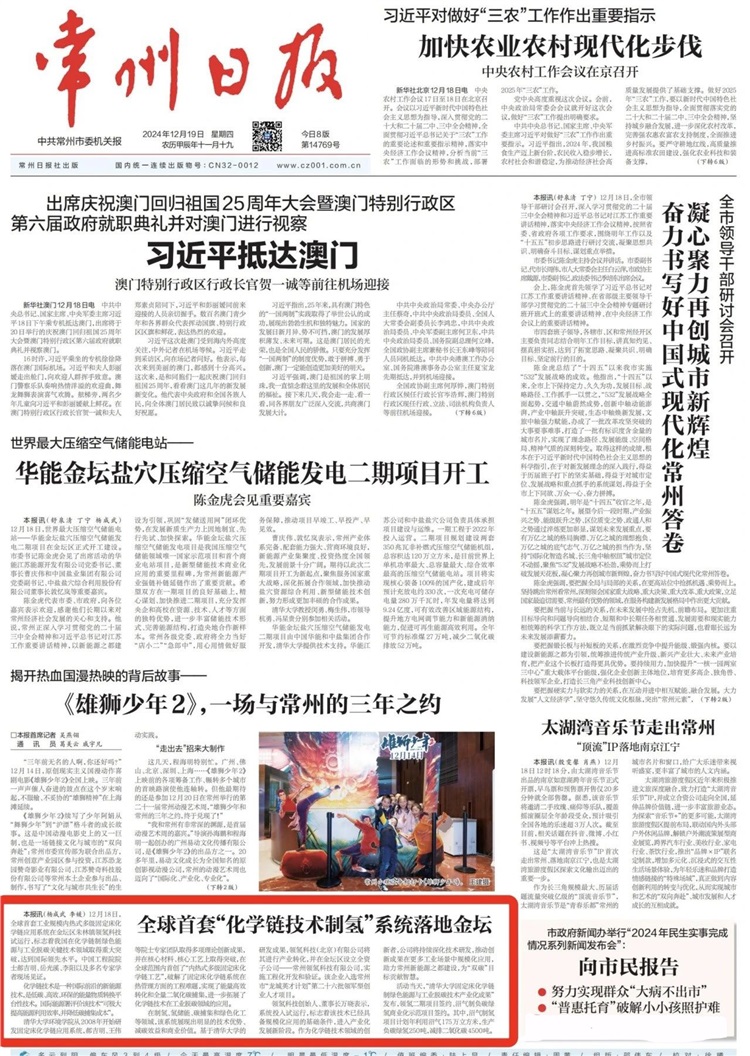 2024年12月18日,全球首套工業規模內熱式多級固定床化學鏈應用系統在常州領氫科技試運行,這標志著我國在化學鏈制綠色能源與工業脫碳關鍵技術領域取得重大突破,達到國際領先水平。中國工程院院士郝吉明、岳光溪、李陽以及多名教授專家學者及知名企業家現場見證。《常州日報》更是在頭版刊發要聞《全球首套“化學鏈制氫”系統落地金壇》,報道領氫科技全球首套“工業規模內熱式多級固定床化學鏈應用系統”啟動試運行。