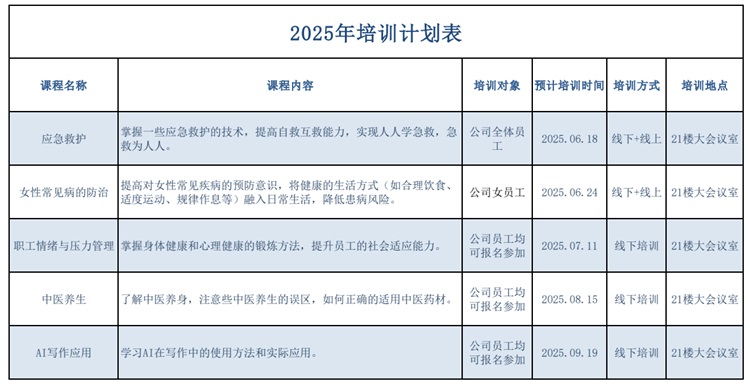 值得一提的是,6月的培訓計劃只是百利鋰電全年安全健康培訓體系的一部分。從應急救護到女性常見病的防治,從職工情緒與壓力管理到中醫養生,再到AI寫作應用等,公司的培訓內容涵蓋多個領域,并通過線下與線上相結合、理論講解與實踐操作相結合的方式,旨在滿足員工多樣化的需求,讓員工真正學有所獲、學以致用。