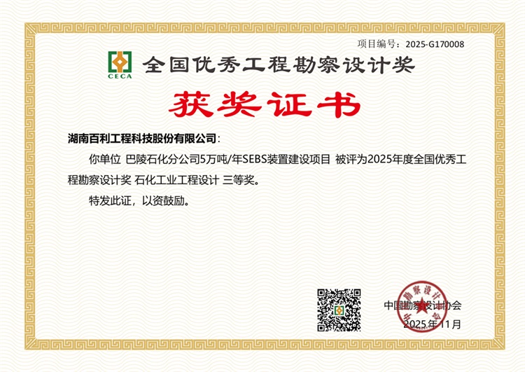 近期,由我司百利科技負責設計的“巴陵石化分公司5萬噸/年SEBS裝置建設項目”榮獲“2025年度全國優(yōu)秀工程勘察設計獎”石化工業(yè)工程設計三等獎,該獎項由中國勘察設計協(xié)會組織評審并頒發(fā)。